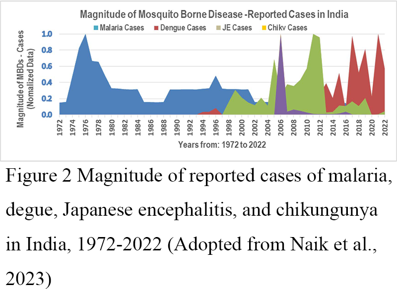 Figure 2 Magnitude of reported cases of malaria, degue, Japanese encephalitis, and chikungunya in India, 1972-2022 (Adopted from Naik et al., 2023) |
