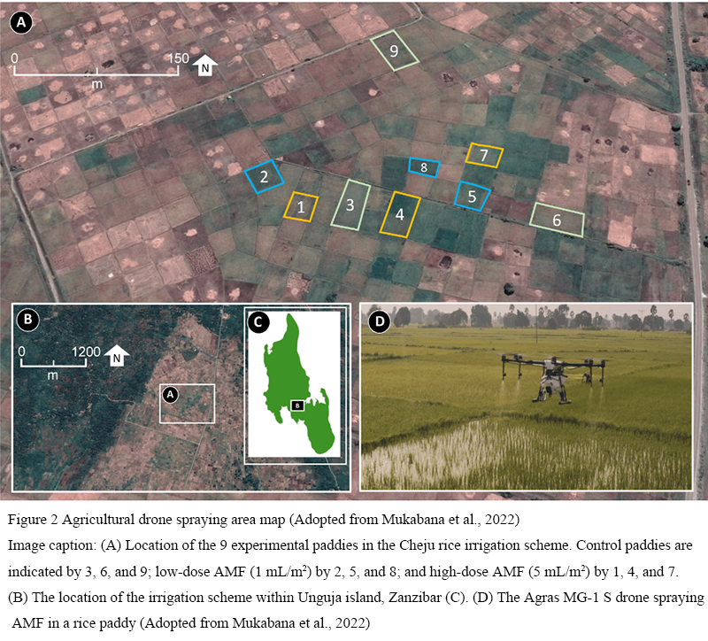 Image caption: (A) Location of the 9 experimental paddies in the Cheju rice irrigation scheme. Control paddies are indicated by 3, 6, and 9; low-dose AMF (1 mL/m2) by 2, 5, and 8; and high-dose AMF (5 mL/m2) by 1, 4, and 7. (B) The location of the irrigation scheme within Unguja island, Zanzibar (C). (D) The Agras MG-1 S drone spraying AMF in a rice paddy (Adopted from Mukabana et al., 2022)