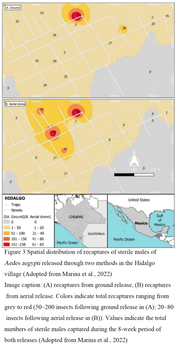 Figure 3 Spatial distribution of recaptures of sterile males of Aedes aegypti released through two methods in the Hidalgo village (Adopted from Marina et al., 2022)