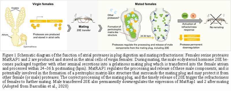 Figure 1 Schematic diagram of the function of atrial proteases in plug digestion and mating refractoriness. Females serine proteases MatRAP1 and 2 are produced and stored in the atrial cells of virgin females. During mating, the male ecdysteroid hormone 20E becomes packaged together with other seminal secretions into a gelatinous mating plug which is transferred into the female atrium and processed within 24-36 h postmating (hpm). MatRAP1 regulates the processing and release of these male components, and is potentially involved in the formation of a peritrophic matrix-like structure that surrounds the mating plug and may protect it from other female (or male) proteases. The correct processing of the mating plug, and the timely release of 20E trigger the refractoriness of females to further mating. Male transferred 20E also permanently downregulates the expression of MatRap1 and 2 after mating (Adopted from Bascuñán et al., 2020) |