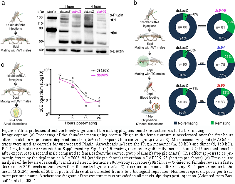 Bascuñán P., Gabrieli P., Mameli E., and Catteruccia F., 2020, Mating-regulated atrial proteases control reinsemination rates in Anopheles gambiae females, Scientific Reports, 10(1): 21974.
