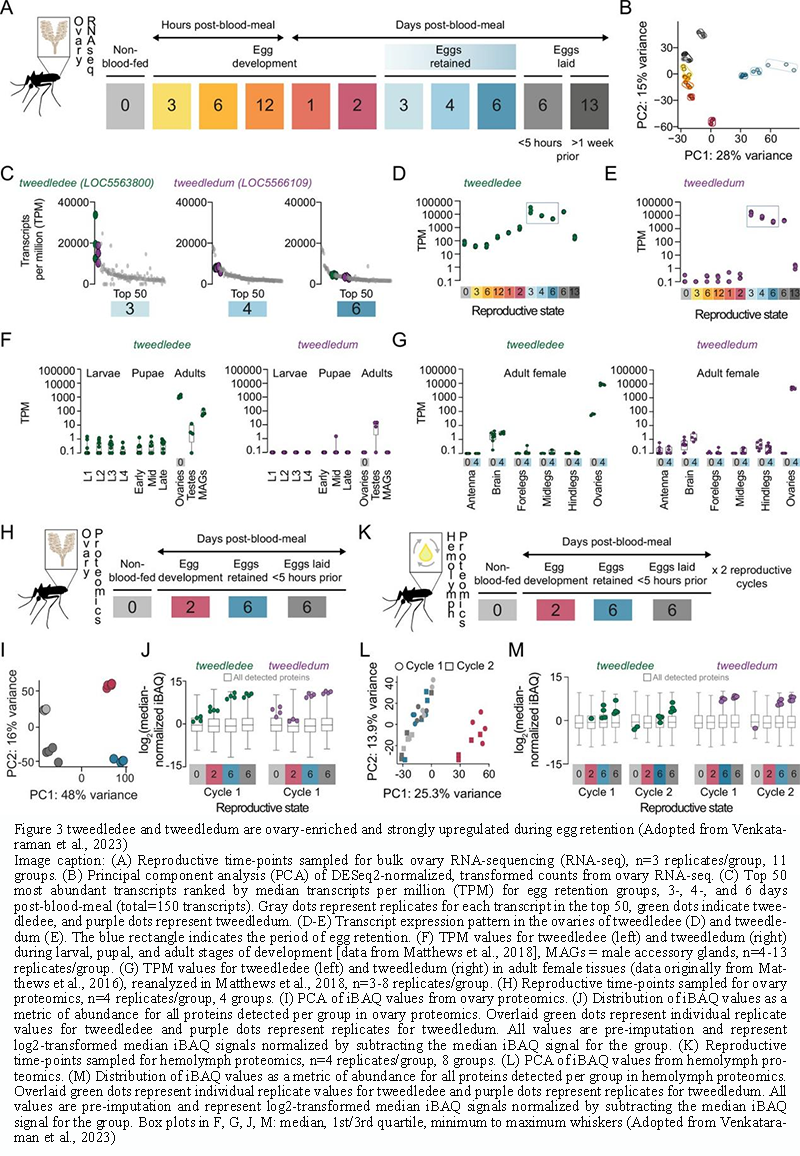 Figure 3 tweedledee and tweedledum are ovary-enriched and strongly upregulated during egg retention (Adopted from Venkataraman et al., 2023) Image caption: (A) Reproductive time-points sampled for bulk ovary RNA-sequencing (RNA-seq), n=3 replicates/group, 11 groups. (B) Principal component analysis (PCA) of DESeq2-normalized, transformed counts from ovary RNA-seq. (C) Top 50 most abundant transcripts ranked by median transcripts per million (TPM) for egg retention groups, 3-, 4-, and 6 days post-blood-meal (total=150 transcripts). Gray dots represent replicates for each transcript in the top 50, green dots indicate tweedledee, and purple dots represent tweedledum. (D-E) Transcript expression pattern in the ovaries of tweedledee (D) and tweedledum (E). The blue rectangle indicates the period of egg retention. (F) TPM values for tweedledee (left) and tweedledum (right) during larval, pupal, and adult stages of development [data from Matthews et al., 2018], MAGs = male accessory glands, n=4-13 replicates/group. (G) TPM values for tweedledee (left) and tweedledum (right) in adult female tissues (data originally from Matthews et al., 2016), reanalyzed in Matthews et al., 2018, n=3-8 replicates/group. (H) Reproductive time-points sampled for ovary proteomics, n=4 replicates/group, 4 groups. (I) PCA of iBAQ values from ovary proteomics. (J) Distribution of iBAQ values as a metric of abundance for all proteins detected per group in ovary proteomics. Overlaid green dots represent individual replicate values for tweedledee and purple dots represent replicates for tweedledum. All values are pre-imputation and represent log2-transformed median iBAQ signals normalized by subtracting the median iBAQ signal for the group. (K) Reproductive time-points sampled for hemolymph proteomics, n=4 replicates/group, 8 groups. (L) PCA of iBAQ values from hemolymph proteomics. (M) Distribution of iBAQ values as a metric of abundance for all proteins detected per group in hemolymph proteomics. Overlaid green dots represent individual replicate values for tweedledee and purple dots represent replicates for tweedledum. All values are pre-imputation and represent log2-transformed median iBAQ signals normalized by subtracting the median iBAQ signal for the group. Box plots in F, G, J, M: median, 1st/3rd quartile, minimum to maximum whiskers (Adopted from Venkataraman et al., 2023) |