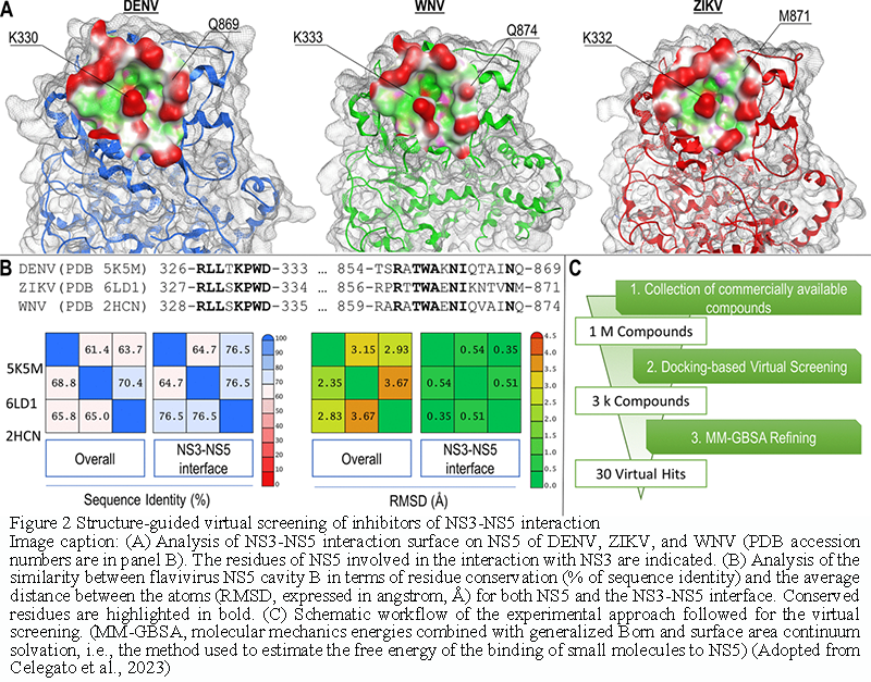 ![]() Figure 2 Structure-guided virtual screening of inhibitors of NS3-NS5 interaction (Adopted from Celegato et al., 2023) Image caption: (A) Analysis of NS3-NS5 interaction surface on NS5 of DENV, ZIKV, and WNV (PDB accession numbers are in panel B). The residues of NS5 involved in the interaction with NS3 are indicated. (B) Analysis of the similarity between flavivirus NS5 cavity B in terms of residue conservation (% of sequence identity) and the average distance between the atoms (RMSD, expressed in angstrom, Å) for both NS5 and the NS3-NS5 interface. Conserved residues are highlighted in bold. (C) Schematic workflow of the experimental approach followed for the virtual screening. (MM-GBSA, molecular mechanics energies combined with generalized Born and surface area continuum solvation, i.e., the method used to estimate the free energy of the binding of small molecules to NS5) (Adopted from Celegato et al., 2023) |
