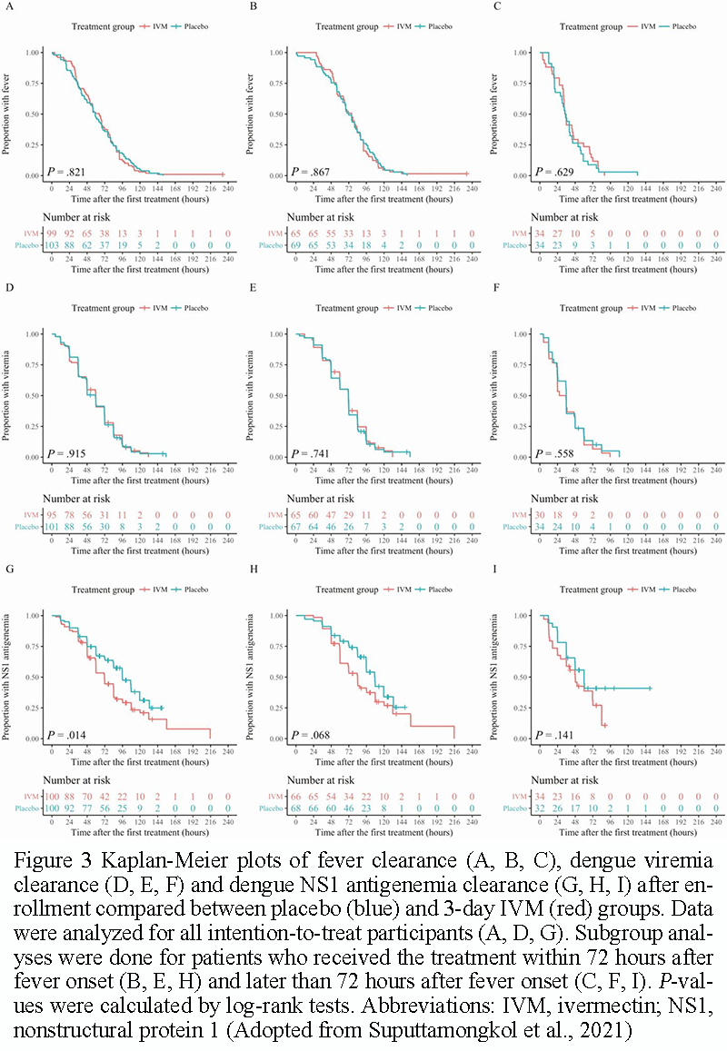 ![]() Figure 3 Kaplan-Meier plots of fever clearance (A, B, C), dengue viremia clearance (D, E, F) and dengue NS1 antigenemia clearance (G, H, I) after enrollment compared between placebo (blue) and 3-day IVM (red) groups. Data were analyzed for all intention-to-treat participants (A, D, G). Subgroup analyses were done for patients who received the treatment within 72 hours after fever onset (B, E, H) and later than 72 hours after fever onset (C, F, I). P-values were calculated by log-rank tests. Abbreviations: IVM, ivermectin; NS1, nonstructural protein 1 (Adopted from Suputtamongkol et al., 2021) |