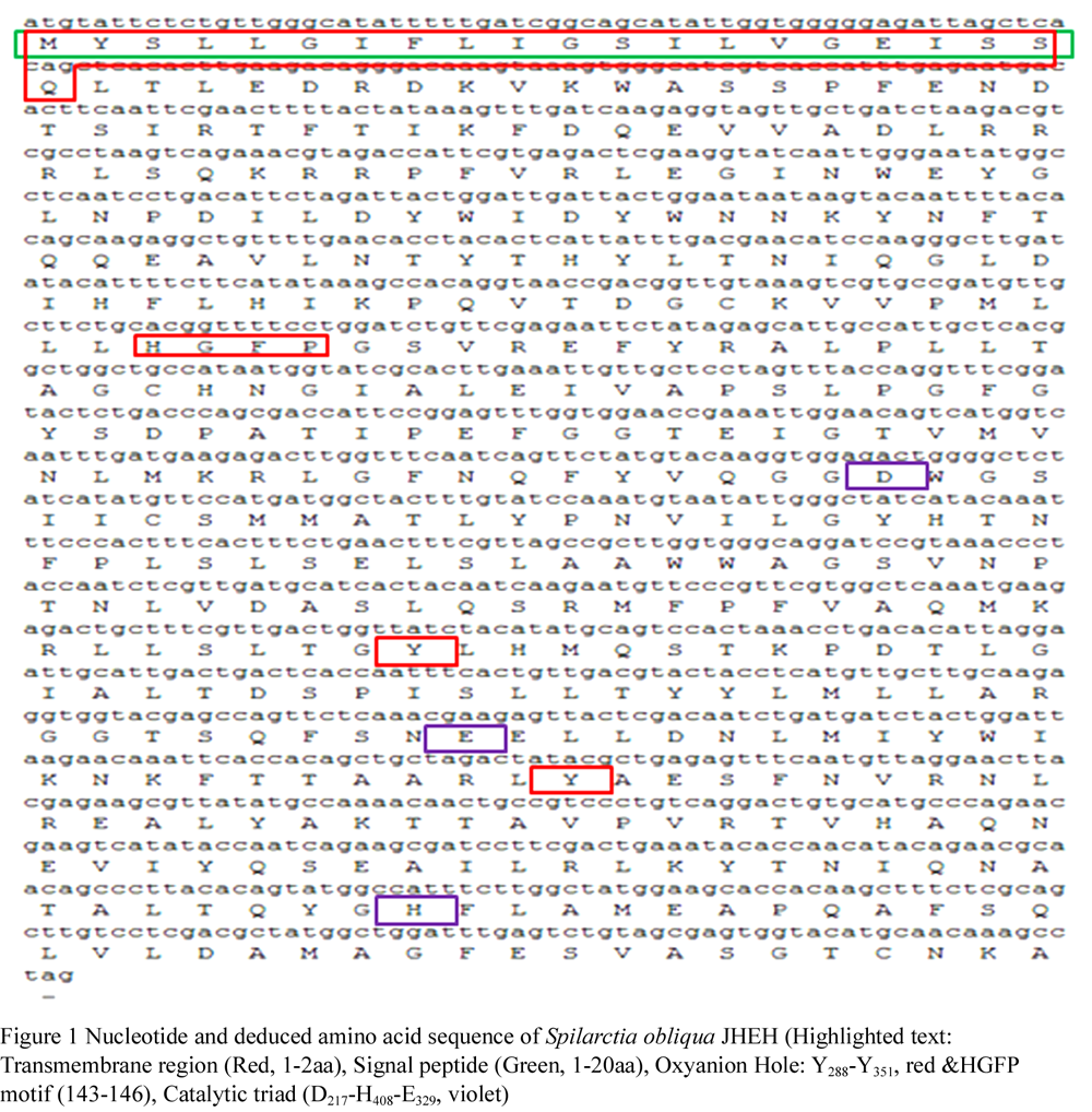 Figure 1 Nucleotide and deduced amino acid sequence of Spilarctia obliqua JHEH (Highlighted text: Transmembrane region (Red, 1-2aa), Signal peptide (Green, 1-20aa), Oxyanion Hole: Y288-Y351, red &HGFP motif (143-146), Catalytic triad (D217-H408-E329, violet)