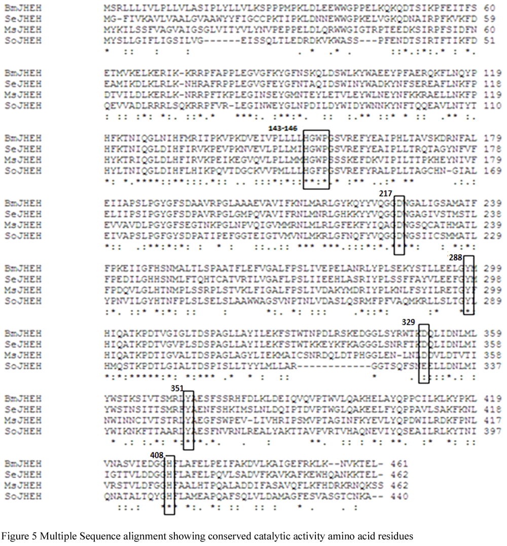 Asp217-His408-Glu329 and the other amino acids forming the Oxyanion hole, Y288-Y351 and HGFP motif (143-146aa) were also found in SoJHEH indicating the conserved mechanism of epoxide hydrolysis of juvenile hormone with an intermediate formation of hydroxyl alkyl-enzyme intermediate.