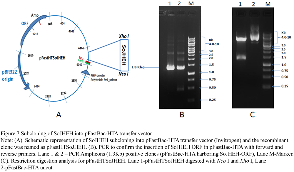 The SoJHEH ORF was sub cloned into Nco I and Xho I cut pFastBac-HTA baculovirus transfer vector (Invitrogen). The transformed PFastBac-HTA was named as PFastHTSoJHEH (Figure 7A) and has been confirmed by colony PCR and restriction digestion (Figure 7B & 7C).