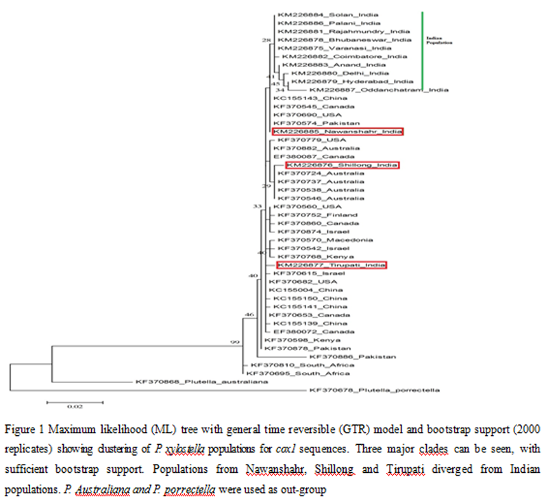 Three major clades can be seen, with sufficient bootstrap support. Populations from Nawanshahr, Shillong and Tirupati diverged from Indian populations. P. Australiana and P. porrectella were used as out-group.