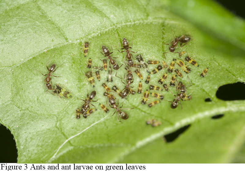 Figure 3 Ants and ant larvae on green leaves