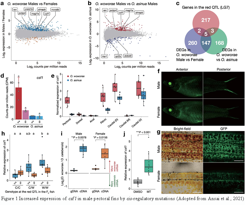 ![]() Figure 1 Increased expression of csf1 in male pectoral fins by cis-regulatory mutations (Adopted from Ansai et al., 2021) |