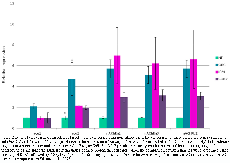 ![]() Figure 2 Level of expression of insecticide targets. Gene expression was normalized using the expression of three reference genes (actin, EF1 and GAPDH) and shown as fold-change relative to the expression of earwigs collected in the untreated orchard. ace1; ace2: acetylcholinesterase target of organophosphates and carbamates; nAChRα1; nAChRα3, nAChRβ2: nicotinic acetylcholine receptor (three subunits) target of neonicotinoids and spinosad. Data are mean values of three biological replicates±SEM, and comparison between samples were performed using One-way ANOVA followed by Tukey test (*p<0.05) indicating significant difference between earwigs from non-treated orchard versus treated orchards (Adopted from Fricaux et al., 2023) |