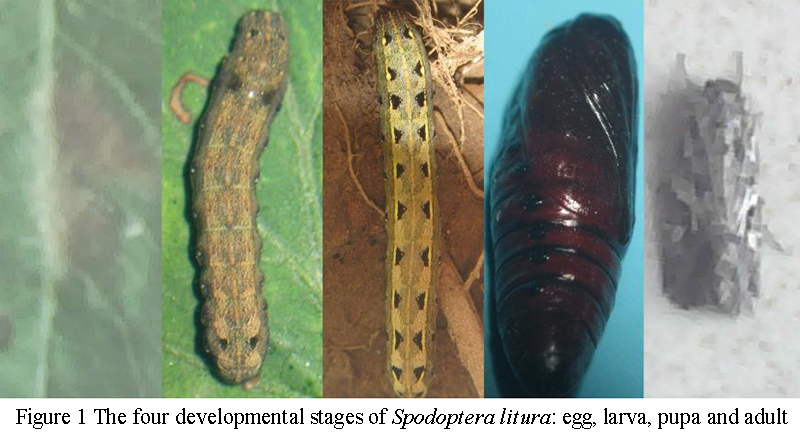 Figure 1 The four developmental stages of Spodoptera litura: egg, larva, pupa and adult