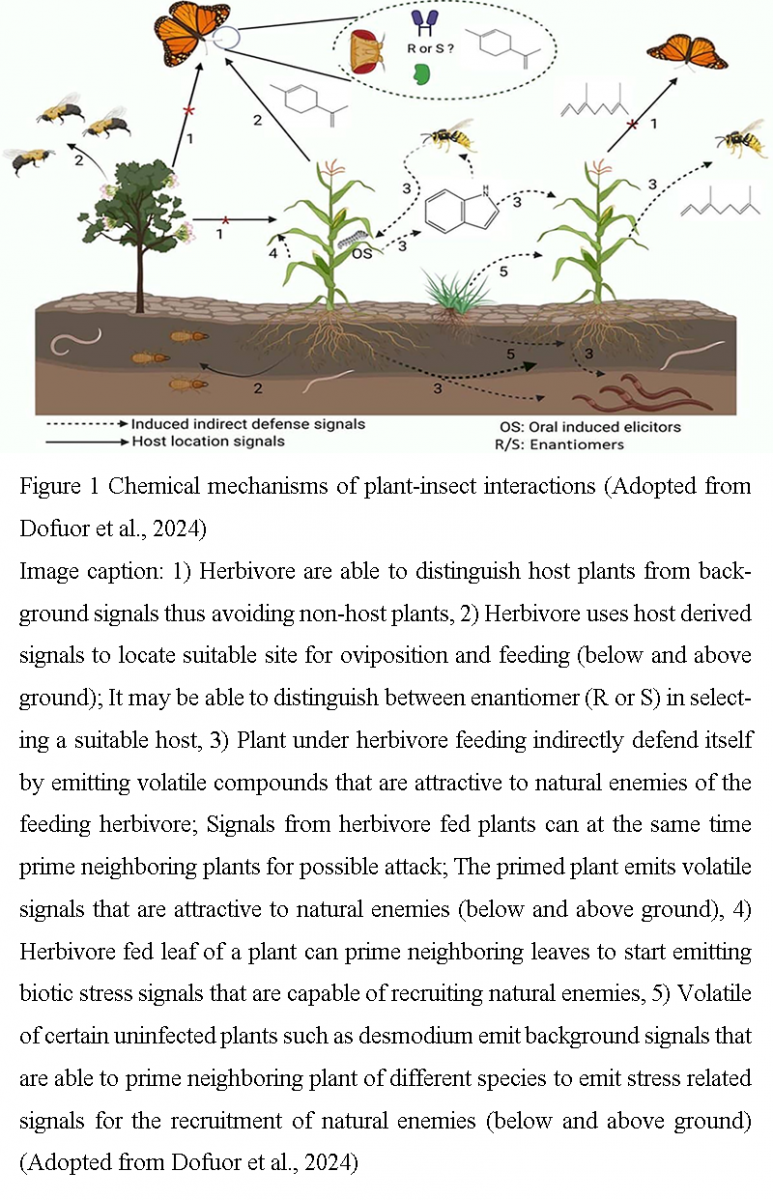 Image caption: 1) Herbivore are able to distinguish host plants from background signals thus avoiding non-host plants, 2) Herbivore uses host derived signals to locate suitable site for oviposition and feeding (below and above ground); It may be able to distinguish between enantiomer (R or S) in selecting a suitable host, 3) Plant under herbivore feeding indirectly defend itself by emitting volatile compounds that are attractive to natural enemies of the feeding herbivore; Signals from herbivore fed plants can at the same time prime neighboring plants for possible attack; The primed plant emits volatile signals that are attractive to natural enemies (below and above ground), 4) Herbivore fed leaf of a plant can prime neighboring leaves to start emitting biotic stress signals that are capable of recruiting natural enemies, 5) Volatile of certain uninfected plants such as desmodium emit background signals that are able to prime neighboring plant of different species to emit stress related signals for the recruitment of natural enemies (below and above ground) (Adopted from Dofuor et al., 2024)