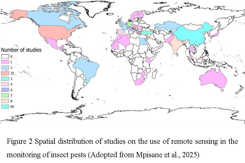 Figure 2 Spatial distribution of studies on the use of remote sensing in the monitoring of insect pests (Adopted from Mpisane et al., 2025)