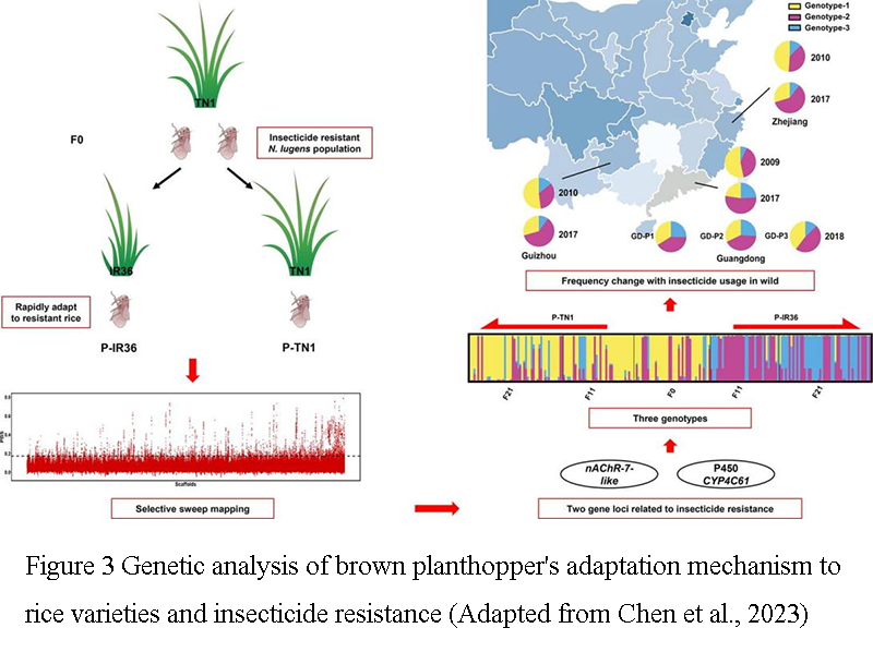Figure 3 Genetic analysis of brown planthopper's adaptation mechanism to rice varieties and insecticide resistance (Adapted from Chen et al., 2023)